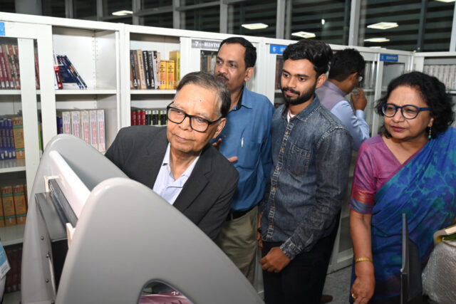 लाईब्रेरी के संबंध में अधिकारियों ने बताया कि यहां पर आरएफआईडी की व्यवस्था लागू की गई है। जिसमें आईडी कार्ड में चिप लगा गया है। पुस्तक इशू करते समय चिप आईडी स्कैन किया जाता है। बिना इशू कराए किताब ले जाने पर सिग्नल बजता है जिससे प्रबंधन को जानकारी मिल जाती है। इसे प्रायोगिक तौर पर प्रतिनिधि मंडल को दिखाया गया। जैसी ही इंडियन पॉलिटी बिना इशू कराए बाहर ले गए, वैसे ही सिग्नल बजा। इस पर सदस्यों ने खुशी जताई।