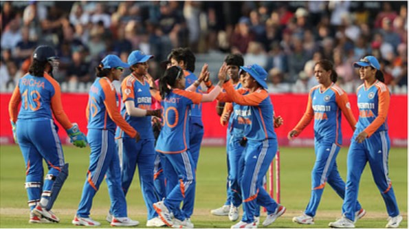 पहले बल्लेबाजी करते हुए भारतीय टीम की शुरुआत खराब रही थी। शेफाली वर्मा तीन रन और पिछले मैच की शतकवीर स्मृति मंधाना 13 रन बनाकर आउट हुईं। कप्तान हरमनप्रीत कौर भी कुछ खास नहीं कर सकीं और एक रन बनाकर पवेलियन लौट गईं। इसके बाद जेमिमा रॉड्रिग्स और अमनजोत कौर ने चौथे विकेट के लिए 93 रन की साझेदारी निभाई। जेमिमा 41 गेंद में नौ चौके और एक छक्के की मदद से 63 रन बनाकर आउट हुईं। वहीं, अमनजोत ने पांचवें विकेट के लिए ऋचा के साथ 57 रन की नाबाद साझेदारी की। अमनजोत 40 गेंद में नौ चौके की मदद से नाबाद 63 रन बना सके, जबकि ऋचा 20 गेंद में छह चौके की मदद से 32 रन बनाकर नाबाद रहीं। इंग्लैंड की ओर से लॉरेन बेल ने दो विकेट लिए। वहीं, लॉरेन फ्लेयर और एम आर्लोट को एक-एक विकेट मिला।