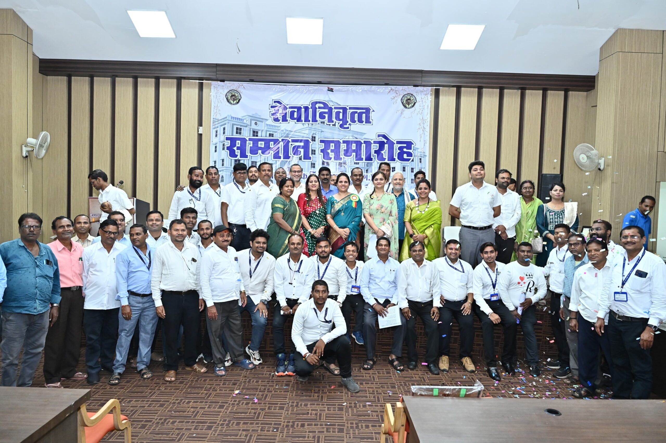 रायपुर। आज रायपुर नगर पालिक निगम अधिकारी कर्मचारी एकता संघ के तत्वावधान में नगर निगम मुख्यालय महात्मा गांधी सदन के चतुर्थ तल निगम सामान्य सभा सभागार में रखे गये आयोजन में रायपुर नगर निगम से जनवरी से जून 2025 के मध्य सेवानिवृत्त 55 निगम अधिकारियों एवं कर्मचारियों की सेवाओ का सामूहिक सम्मान महापौर श्रीमती मीनल चौबे के मुख्य आतिथ्य, सभापति श्री सूर्यकांत राठौड़ की अध्यक्षता, आयुक्त श्री विश्वदीप, सामान्य प्रशासन एवं विधि विधायी कार्य विभाग अध्यक्ष डॉ. अनामिका सिंह, जोन 5 जोन अध्यक्ष श्री अम्बर अग्रवाल के विशेष आतिथ्य और मंच पर अपर आयुक्त श्रीमती कृष्णा खटीक, श्री विनोद पाण्डेय, जोन 8 कमिश्नर श्रीमती राजेश्वरी पटेल, कर्मचारी संघ के पूर्व अध्यक्ष श्री अरूण दुबे, नगर निगम अधिकारी कर्मचारी एकता संघ अध्यक्ष श्री प्रमोद जाधव की उपस्थिति में किया गया। सेवानिवृत्त निगम अधिकारियों, कर्मचारियों को अधिकारी कर्मचारी एकता संघ द्वारा श्रीफल शॉल, स्मृति चिन्ह प्रदत्त कर पुष्पहार पहनाकर उनकी निगम को दी सेवाओं का सम्मान किया गया।