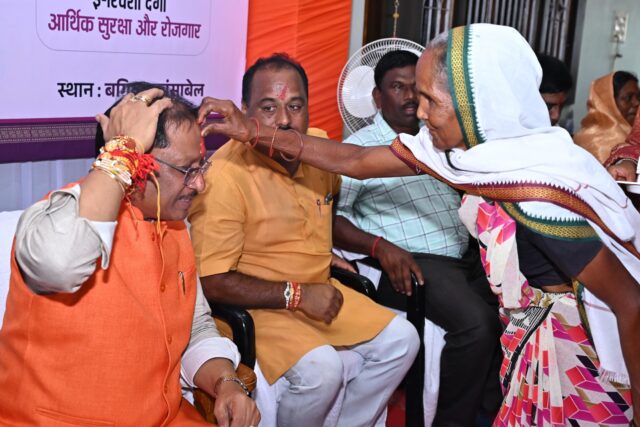 रायपुर। मुख्यमंत्री विष्णु देव साय के गृह ग्राम बगिया स्थित कैंप कार्यालय में रक्षाबंधन के अवसर पर विभिन्न योजनाओं से लाभान्वित बहनों ने राखी बांधकर आभार व्यक्त किया। प्रधानमंत्री आवास योजना, महतारी वंदन योजना की हितग्राही दीदियों के साथ आंगनबाड़ी कार्यकर्ता-सहायिकाएँ, मितानिन और स्व-सहायता समूह की बहनों ने भी मुख्यमंत्री श्री साय की कलाई पर राखी बांधी और उनके दीर्घायु की कामना की।