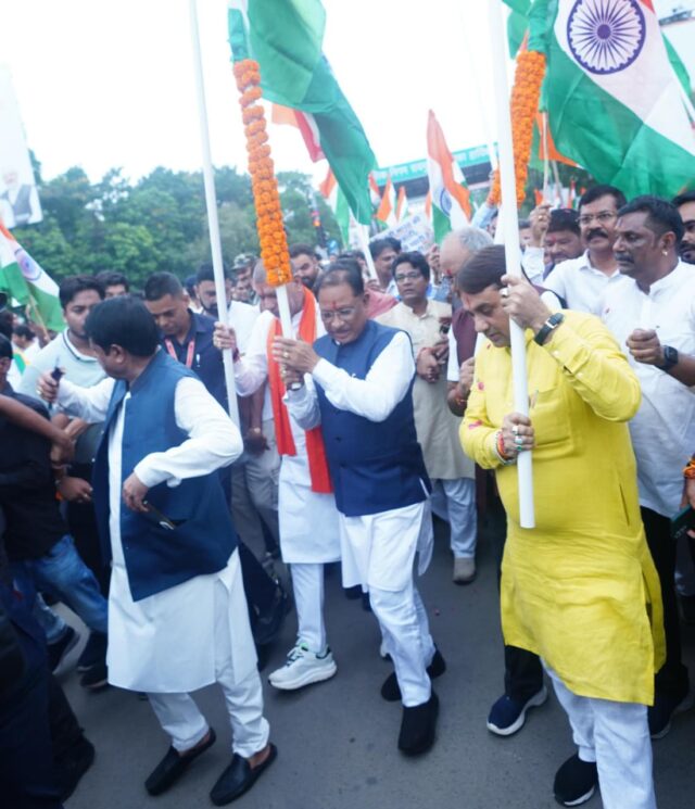 उल्लेखनीय है कि आजादी के अमृत महोत्सव के अंतर्गत प्रधानमंत्री श्री नरेंद्र मोदी जी के आह्वान पर चलाए जा रहे हर घर तिरंगा अभियान के तहत रायपुर में भव्य तिरंगा यात्रा का आयोजन किया गया। रायपुर के शहीद स्मारक भवन से तेलीबांधा तक निकली तिरंगा यात्रा में मुख्यमंत्री श्री विष्णु देव साय स्वयं शामिल हुए और हजारों नागरिकों के साथ कदम से कदम मिलाकर देशभक्ति का संदेश दिया। यात्रा के दौरान ‘भारत माता की जय’ और ‘वंदे मातरम्’ के नारों से पूरा मार्ग गूंज उठा।