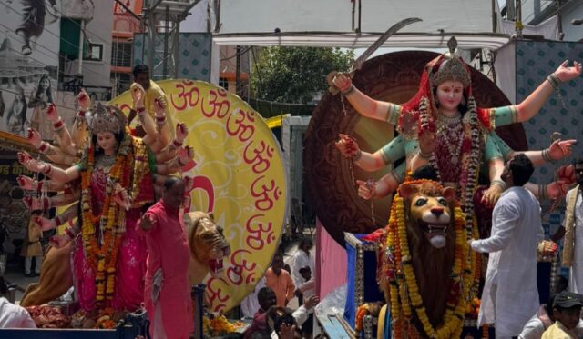 दुर्ग:- छत्तीसगढ़ की धर्मिक नगरी दुर्ग के गंजपारा में स्थित श्री सत्तीचौरा दुर्गा मंदिर एवं पुरानी गंजमडी गंजपारा में इस क्वांर पर्व में माता जी को पंडाल में विराजमान कटने के पूर्व विगत 48 वर्षों की परम्परानुसार दोनों बहनों पुरानी गंजमण्डी में विराजमान होने वाली माता बड़ी बहन एवं सत्तीचौरा में विराजमान होने वाली माता छोटी बहन को पंडाल में स्थापित करने के पूर्व नगर भ्रमण के दौरान एक स्थान पर मिलाया गया,