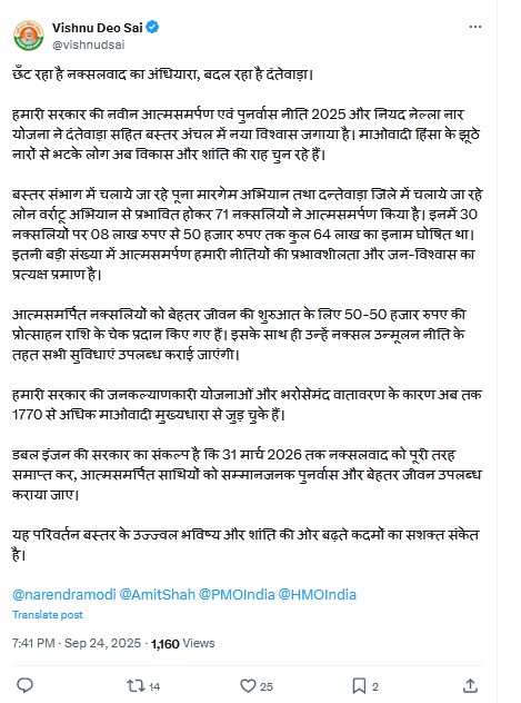 मुख्यमंत्री श्री साय ने कहा कि बस्तर संभाग में चलाए जा रहे पूना मारगेम अभियान तथा दंतेवाड़ा जिले में चलाए जा रहे लोन वर्राटू अभियान से प्रभावित होकर हाल ही में 71 नक्सलियों ने आत्मसमर्पण किया है। इनमें 30 नक्सलियों पर 50 हजार से 8 लाख रुपये तक का कुल 64 लाख रुपये का इनाम घोषित था। उन्होंने कहा कि इतनी बड़ी संख्या में आत्मसमर्पण हमारी नीतियों की प्रभावशीलता और जन-विश्वास का प्रत्यक्ष प्रमाण है।