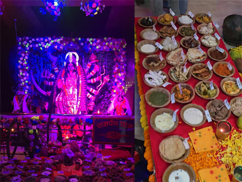 राजनांदगांव। शहर के वार्ड नंबर 1 बाबुटोला स्थित शक्तिधाम महाकाली मंदिर में शारदीय नवरात्र महोत्सव हर्षोल्लास के साथ मनाया जा रहा है। नवरात्र के पंचमी के शुभ अवसर पर माँ महाकाली का विशेष मनोरम श्रृंगार किया गया, जिसे देखने बड़ी संख्या में श्रद्धालु पहुंचे। माता को इस अवसर पर 56 प्रकार के पारंपरिक छत्तीसगढ़ी व्यंजनों का भोग अर्पित किया गया।