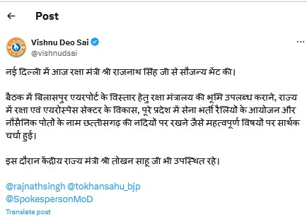 मुख्यमंत्री विष्णुदेव साय ने बैठक के दौरान रक्षा मंत्री राजनाथ सिंह को अवगत कराया कि बिलासपुर में रक्षा मंत्रालय की भूमि है। इस भूमि को उन्होंने बिलासपुर एयरपोर्ट के विस्तार के लिए उपलब्ध कराने का अनुरोध किया। इसके साथ ही मुख्यमंत्री ने यहां रक्षा क्षेत्र से संबंधित विकासात्मक कार्य भी आरंभ करने का आग्रह किया।
