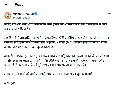 मुख्यमंत्री विष्णुदेव साय ने भारतीय पैरा-एथलीट्स के इस गौरवपूर्ण प्रदर्शन पर हार्दिक बधाई देते हुए कहा कि यह उपलब्धि पूरे राष्ट्र के लिए प्रेरणा का स्रोत है। उन्होंने कहा कि हमारे पैरा-एथलीट्स ने यह सिद्ध कर दिया है कि जब संकल्प अडिग हो और मेहनत निरंतर, तब कोई भी मंज़िल असंभव नहीं होती। यह प्रदर्शन न केवल खेल जगत के लिए प्रेरणादायक है, बल्कि देश के प्रत्येक नागरिक में नई ऊर्जा और आत्मविश्वास का संचार करता है।