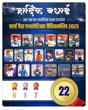 रायपुर- नई दिल्ली में आयोजित वर्ल्ड पैरा एथलेटिक्स चैंपियनशिप 2025 में भारत के पैरा-एथलीट्स ने अदम्य जज़्बे और अथक परिश्रम के बल पर विश्व पटल पर नया इतिहास रच दिया है। इस प्रतिष्ठित प्रतियोगिता में भारतीय दल ने अब तक का सर्वश्रेष्ठ प्रदर्शन करते हुए 6 स्वर्ण, 9 रजत और 7 कांस्य सहित कुल 22 पदक जीतकर देश का नाम रोशन किया है।