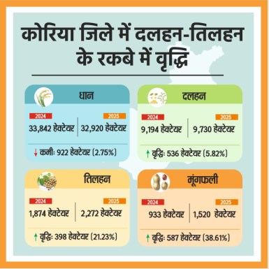 मुख्यमंत्री विष्णुदेव साय द्वारा प्रदेश के किसानों और ग्रामीणों को आर्थिक रूप से सशक्त बनाने के लिए उठाए गए ठोस कदमों का ही यह परिणाम है कि अब जिले के किसान फसल विविधिकरण की ओर अग्रसर हो रहे हैं। जिले के किसान धान के अलावा दलहन, तिलहन फसलों के माध्यम से अपनी आमदनी बढ़ाने में रूचि ले रहे हैं। आने वाले समय में कोरिया जिला दलहन-तिलहन उत्पादन के क्षेत्र में अग्रणी जिलों में शामिल होगा। कृषि विभाग द्वारा किसानों को उन्नत बीज, तकनीकी मार्गदर्शन और विपणन सुविधाएं उपलब्ध कराई जा रही हैं। विभागीय अधिकारियों के अनुसार जलवायु और मिट्टी की उपयुक्तता के चलते जिले में तिलहन और दलहन दोनों फसलों के पैदावार में और वृद्धि की संभावना है।