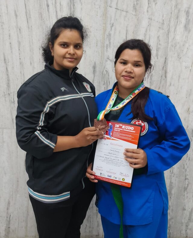 महासमुन्द (समय दर्शन न्यूज)। राष्ट्रीय कुडो चैंपियनशिप मे महासमुंद की मीरा पंडा ने छत्तीसगढ़ के लिए खेल के प्रथम दिन ही कांस्य पदक जीतकर खाता खोलते हुए छत्तीसगढ़ का नाम रौशन कर दिया है। सूरत के पंडित दिन दयाल उपाध्याय इंडोर स्टेडियम मैं 25 अक्टूबर को दोपहर 2 बजे रिंग नम्बर 02 को हुआ जिसमें महासमुंद के मीरा पंडा ने पदक जीतकर इतिहास रच दिया है। यह आयोजन 24 से 31 अक्टूबर तक आयोजीत होगी। छत्तीसगढ़ के हेड कोच राजा कौशल अध्यक्ष लिलिमा मैडम के मार्गदर्शन में छत्तीसगढ़ के खिलाड़ियों को कुडो खेल का लाभ मिल रहा है।