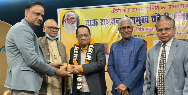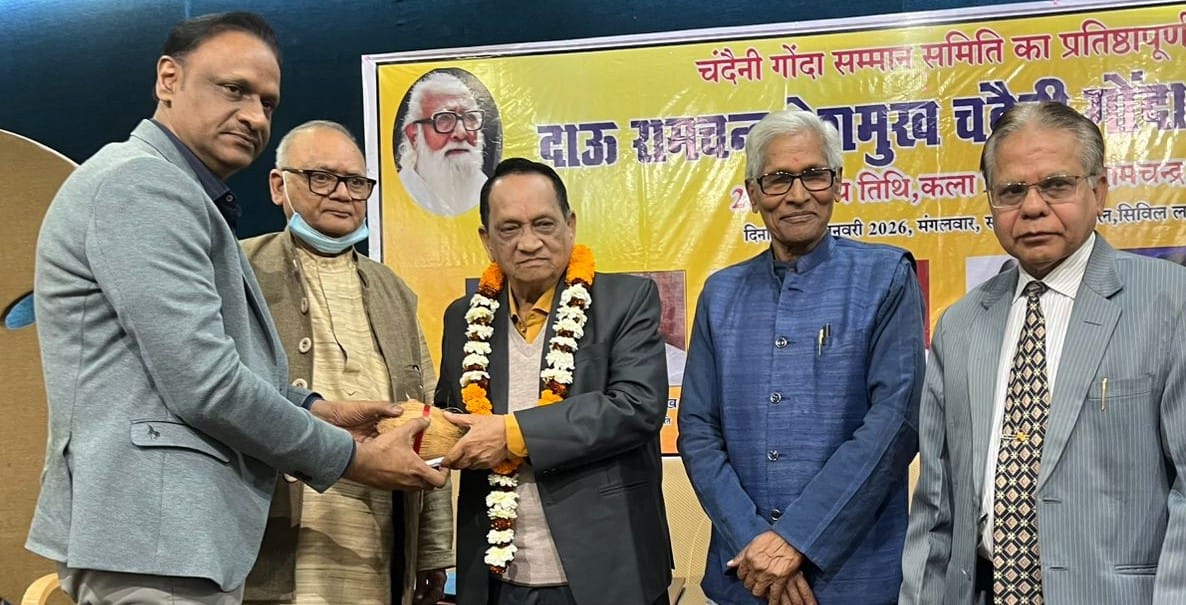रायपुर. छत्तीसगढ़ के कला ऋषि दाऊ रामचंद्र देशमुख की 28वीं पुण्यतिथि पर चंदैनी गोंदा सम्मान समारोह का आयोजन किया गया। वृंदावन हॉल में आयोजित समारोह में सुप्रसिद्ध गीतकार रामेश्वर वैष्णव “प्रथम चंदैनी गोंदा सम्मान 2026” से अलंकृत हुए। कार्यक्रम संयोजक डॉ तरुण नायक ने उन्हें ग्यारह हजार एक रुपए सम्मान राशि, शाल, श्रीफल, प्रतीक चिन्ह एवं सम्मान पत्र भेंट किया।