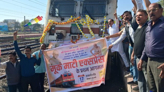 ​राजनांदगांव। जैन समाज की वर्षों पुरानी आस्था से जुड़ी मांग को केंद्र सरकार ने स्वीकार कर लिया है। जबलपुर–रायपुर–जबलपुर इंटरसिटी एक्सप्रेस का नाम अब जैन धर्म के प्रसिद्ध ग्रंथ ‘मूकमाटी’ के नाम पर रखे जाने से समाज में उत्साह का माहौल है। नाम परिवर्तन के बाद जब यह ट्रेन पहली बार राजनांदगांव रेलवे स्टेशन पहुंची, तो यहां ऐतिहासिक और उत्सव जैसा दृश्य देखने को मिला।