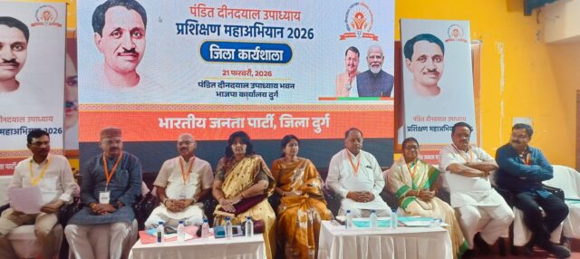 दुर्ग (समय दर्शन)। भारतीय जनता पार्टी की राष्ट्रीय एवं प्रदेश स्तरीय पंडित दीनदयाल उपाध्याय प्रशिक्षण महा अभियान 2026 कार्यशाला के समापन के पश्चात दुर्ग जिला भाजपा कार्यालय में एक दिवसीय कार्यशाला का आयोजन संपन्न हुआ आयोजित कार्यशाला में मुख्य वक्ता कैबिनेट मंत्री गजेंद्र यादव रहे उनके साथ सह वक्ता भाजपा प्रदेश उपाध्यक्ष एवं दुर्ग जिला संगठन प्रभारी नंदन जैन, कार्यक्रम की प्रदेश सहसंयोजीका एवं दुर्ग संभाग प्रभारी भाजपा प्रदेश प्रवक्ता शताब्दी पांडेय, प्रदेश आई टी सेल सह संयोजक प्रमोद सिंह उपस्थित रहे आयोजित कार्यक्रम में कार्यक्रम के अध्यक्षता कर रहे जिला भाजपा अध्यक्ष सुरेंद्र कौशिक, दुर्ग महापौर अलका बाघमार भाजपा प्रदेश कार्य समिति सदस्य उषा टावरी जिला भाजपा महामंत्री दिलीप साहू विनोद अरोरा, वरिष्ठ भाजपा नेता कांतिलाल बोथरा, आर्थिक प्रकोष्ठ प्रदेश संयोजक शिव चंद्राकर, जिला भाजपा उपाध्यक्ष एवं प्रशिक्षण महाअभियान के सदस्य शिवेंद्र परिहार, पिछड़ा वर्ग मोर्चा अध्यक्ष एवं कार्यक्रम सदस्य तेखन सिन्हा, कार्यक्रम सदस्य राजेंद्र पाध्ये उपस्थित रहे आयोजित कार्यशाला तीन सत्र में आयोजित की गई | प्रथम सत्र की शुरुआत वंदे मातरम के गीत एवं राजकीय गीत के वाचन के पश्चात प्रारंभ की गई एवं समापन राष्ट्रीय गीत वाचन के पश्चात किया गया|